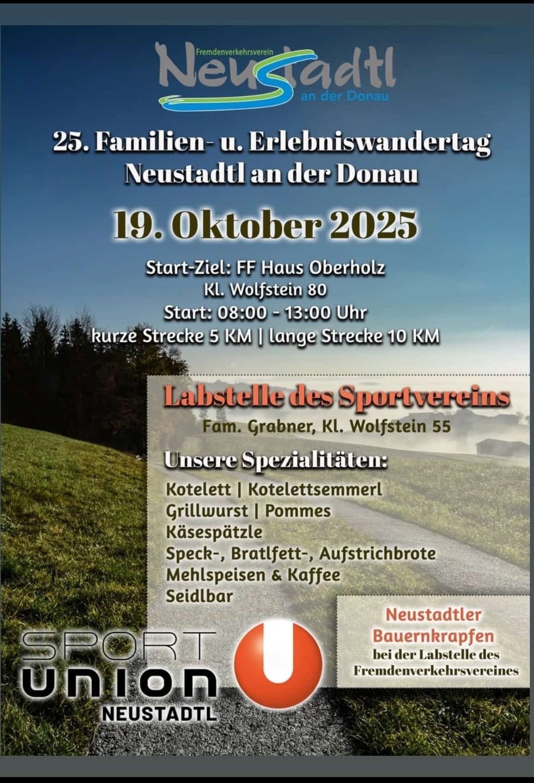 Es wird wieder eine kürzere Strecke mit 6 Kilometer und eine längere Route von etwa 10 Kilometer geben. Zudem gibt es eine Labstelle beim Anwesen Aichinger in Pfaffenberg und beim Hause Grabner in Groß-Dachgrub sowie eine Getränkestation bei der Hubertuskapelle. Es wird auch wieder die beliebten "Neustadtler Bauernkrapfen geben.