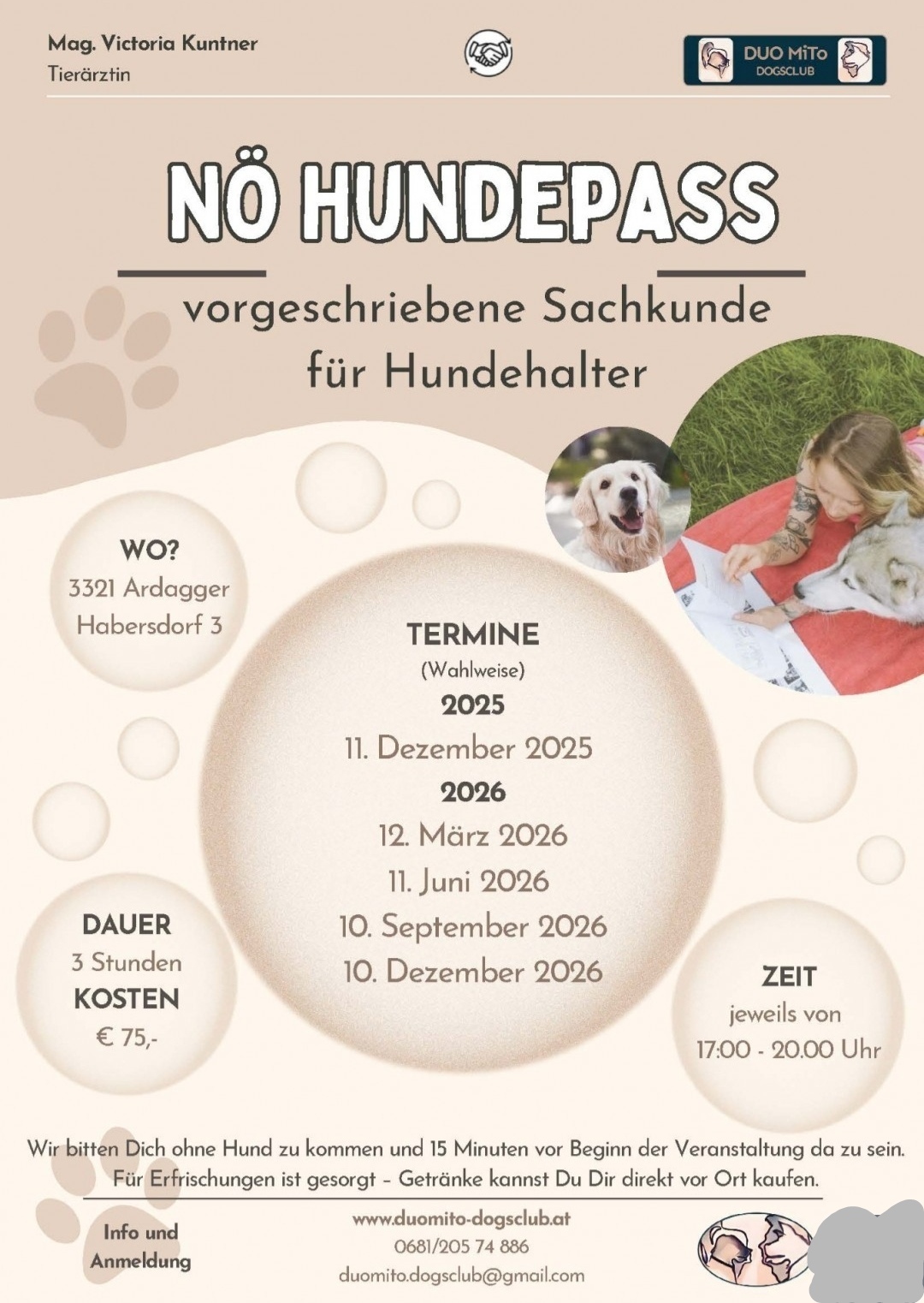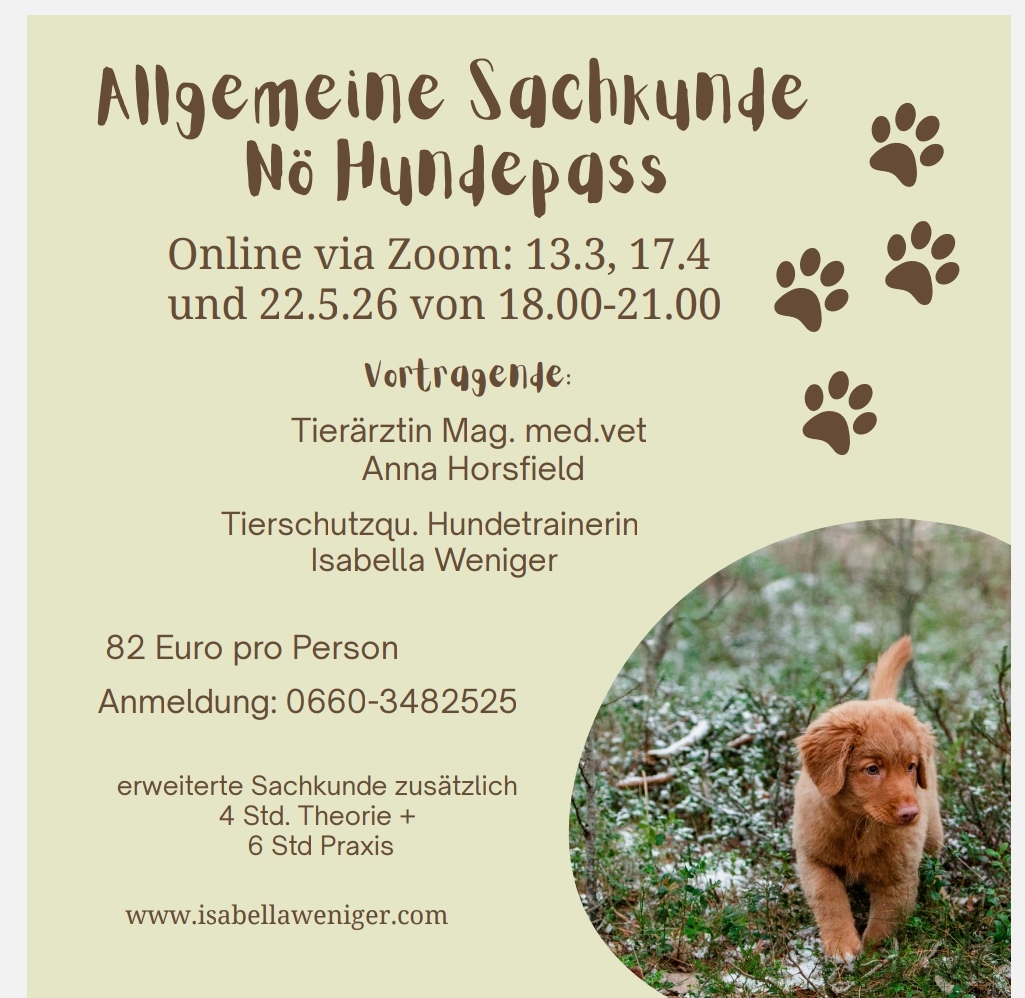 Wir sind dipl. Verhaltensberaterinnen für Hunde und freuen uns, Ihnen mitteilen zu können, dass wir den Vortrag für den NÖ-Hundepass (allgemeine Sachkunde) nun auch online anbieten. Der NÖ-Hundepass ist ein wertvolles Instrument für Hundebesitzer, um die Gesundheit und das Wohlbefinden der Vierbeiner sicherzustellen.