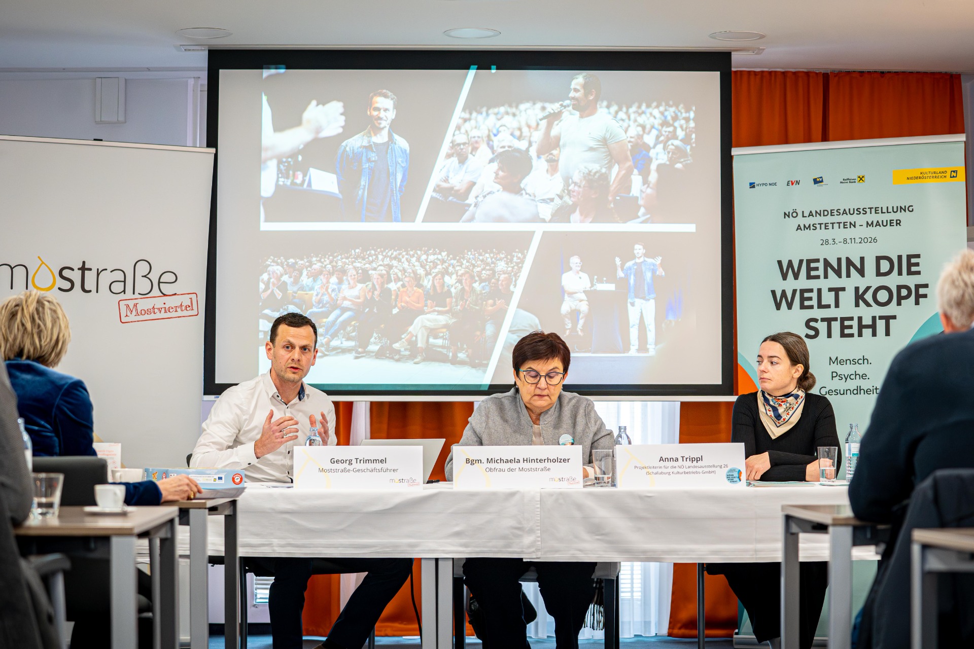 Die LEADER-Region Tourismusverband Moststraße lud am Donnerstag, den 12. Februar 2026, zum Pressegespräch ins Stadthotel Gürtler in Amstetten. Im Mittelpunkt stand die Frage: „Die Landesausstellung findet in der Region statt – welche Rolle übernimmt dabei die Moststraße?“ Das Podium – bestehend aus Moststraße-Obfrau Bgm. Michaela Hinterholzer, Moststraße-Geschäftsführer Georg Trimmel und Anna Trippl, Projektleiterin für die Niederösterreichische Landesausstellung 2026 seitens der Schallaburg-KulturbetriebsgmbH – beantwortete sie klar: Die Moststraße bereitet Region und Umfeld so vor, dass aus einem Ausstellungsbesuch ein stimmiges Gesamterlebnis wird und Wertschöpfung in der Region bleibt.